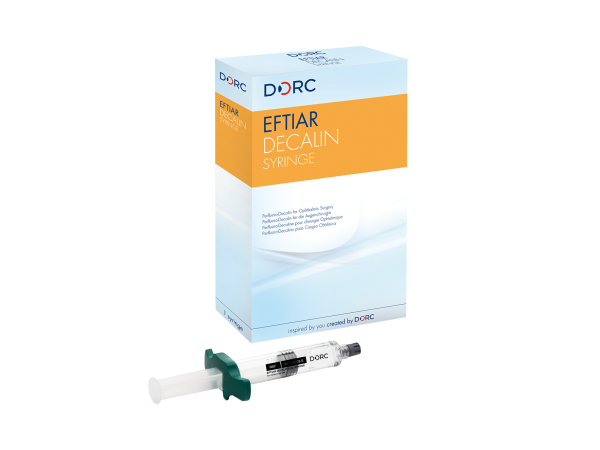 • Supplied in HPPS (high performance polymer syringes) • Easy-to-use syringe format with flange extender and integrated luer lock for easy handling • Maximized purity • >99.999% fluorinated • Chemically inert liquid • Transparent, colourless and optically clear • Low refractive index • High specific gravity • Smooth flattening of a detached retina • Passive drainage of subretinal fluid DORC uses a combination of multi-step ultrapurification and analytical characterisation verification to eliminate inherent impurity risks applicable to both Octane and Decalin